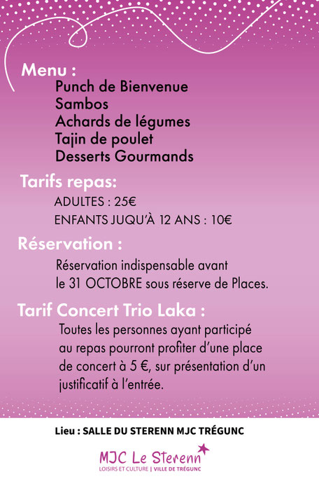 Repas payant (au bénéfice des actions de soutien à l’école) : réservation indispensable